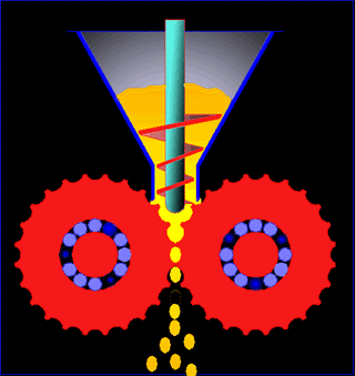 1、給料部分,主要是實現(xiàn)定量給料來保證物料均勻進入對輥間。螺旋送料裝置由電磁調(diào)速電機驅(qū)動,經(jīng)皮帶輪、蝸桿減速器轉(zhuǎn)動,將被壓物料強制壓入主進料口。由于電磁調(diào)速電機恒矩特性,當螺旋送料機的壓料量與主機所需物料量相等時,可以保持恒定的供料壓力使球團質(zhì)量穩(wěn)定。如供料量過大,則送料裝置的電過載;供料量過小則不成球。因此熟練的操作技是保證壓球正常工作的重要條件。