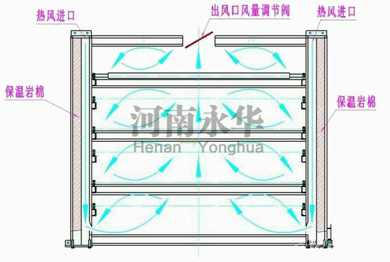 網(wǎng)帶采用12-60目不銹鋼絲網(wǎng),由傳動裝置拖動在干燥機(jī)內(nèi)移動。干燥段由若干單元組成,每一單元熱風(fēng)獨(dú)立循環(huán),其中部分尾氣由專門排濕風(fēng)機(jī)排出,每一單元排出氣量均有調(diào)節(jié)閥控制。在上循環(huán)單元中,循環(huán)風(fēng)機(jī)出來的風(fēng)由側(cè)面風(fēng)道進(jìn)入單元下腔,氣流向上通過換熱器加熱,并經(jīng)分配器分配后。成噴射流吹向網(wǎng)帶,穿過物料后進(jìn)入上腔。干燥過程是熱風(fēng)氣流穿過物料層,完成熱量與質(zhì)量傳達(dá)過程。上腔由風(fēng)管與風(fēng)機(jī)入口相連,大部分氣流體循環(huán),一部分溫度較低含濕量較大的氣體作為廢氣經(jīng)排濕管、調(diào)節(jié)閥、跳濕風(fēng)機(jī)排出。下循環(huán)單元中,循環(huán)風(fēng)機(jī)出來的風(fēng)先進(jìn)入上腔,向下經(jīng)換熱器加熱,穿過物料層進(jìn)入下腔,下腔由側(cè)面風(fēng)道及回風(fēng)管與風(fēng)機(jī)入口相連,大部分氣體循環(huán),一部分排出。上下循環(huán)單元根據(jù)用戶需要可靈活配備,單元數(shù)量亦可根據(jù)需要選取。