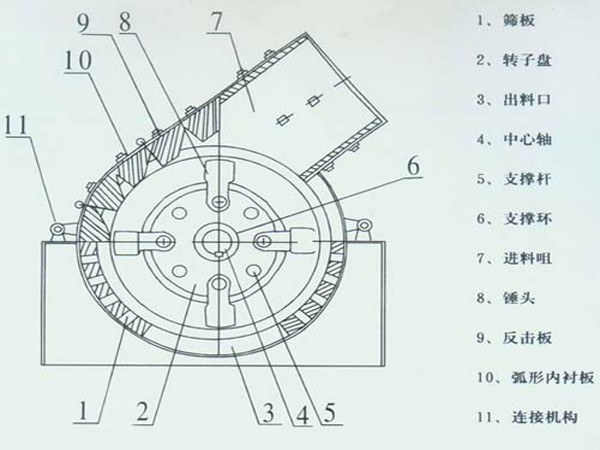 1.機(jī)殼2.轉(zhuǎn)子3.主軸4.錘頭5.襯板和打擊板